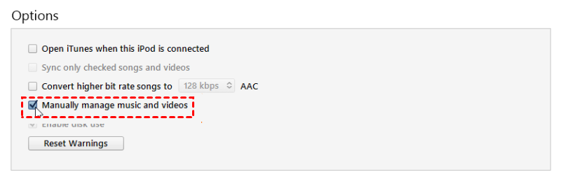 Step 2: Click the phone icon and locate the Summary window > Scroll down to select Manually manage music and videos.