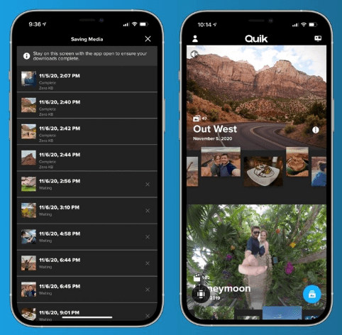 Tap the 3x3 grid icon next to the red circle from the GoPro Quick app to go to the camera's gallery > Hit a video you need > Tap the download icon from the new page. Wait for a while, when the download progress bar says Complete, you can go to the Photos app on iPhone to check your data.