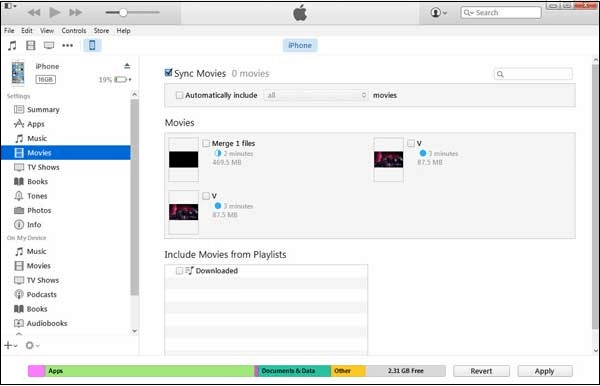 Step 3. Click the device icon under the File option and select Movies under the Settings section > Click Sync Movies > Select the footage you want to sync and click Apply to make it.