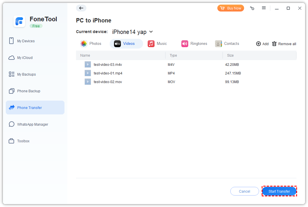- To add long videos, large videos or 5K/5.3K videos to iPhone at a super-fast speed, choosing FoneTool mentioned in Method 2.