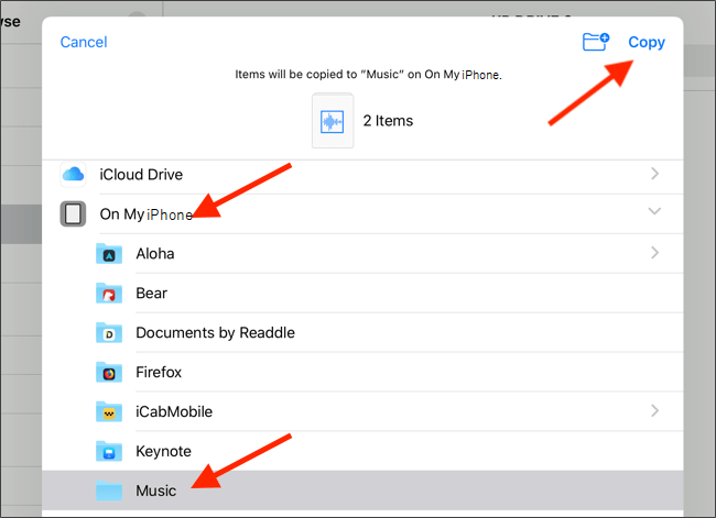 Step 4. Here you could choose the destination of the selected files > Find the new folder and tap Copy. Finally, you can get USB music imported to iPhone.