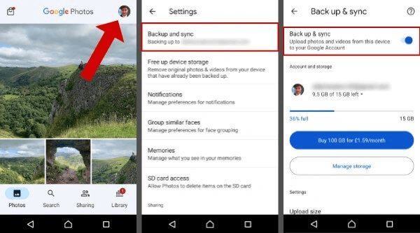 Step 2: Access the Google Photos Settings and enable the Backup & Sync option > Upload the photos you wish to transfer to the Google Photos app on your Android.