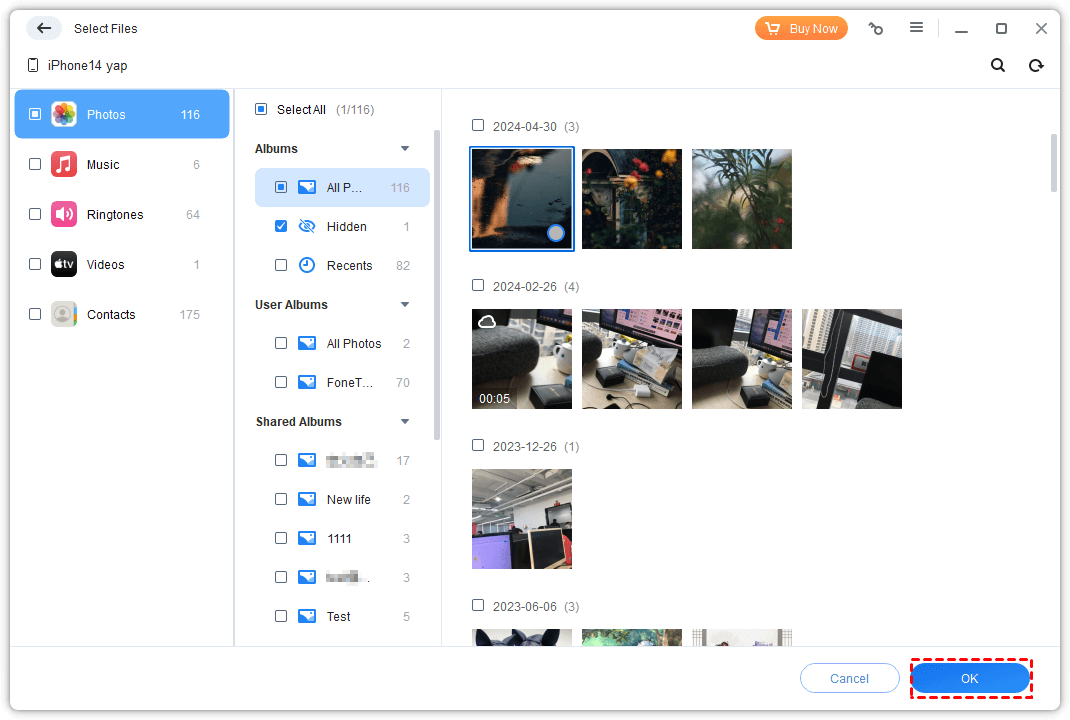 Step 2. Under the Photos tab > Preview and choose the photos from your iPad > Click OK.