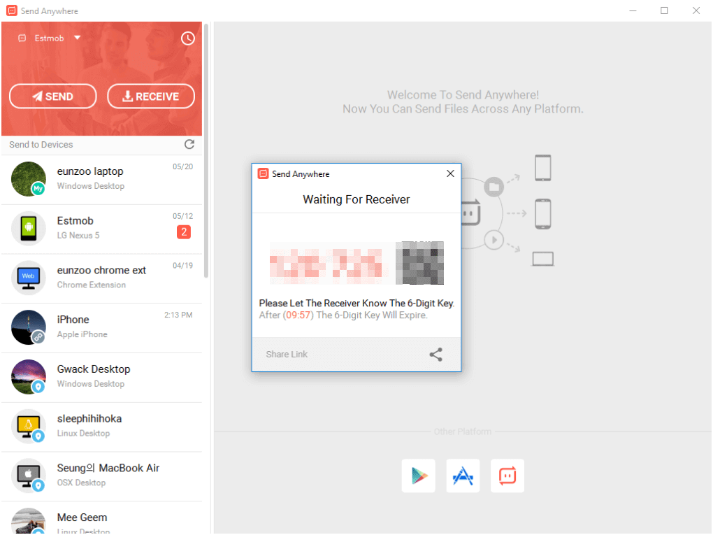 Step 3. On PC: Visit Send Anywhere website > Enter the 6-digit key to receive files.