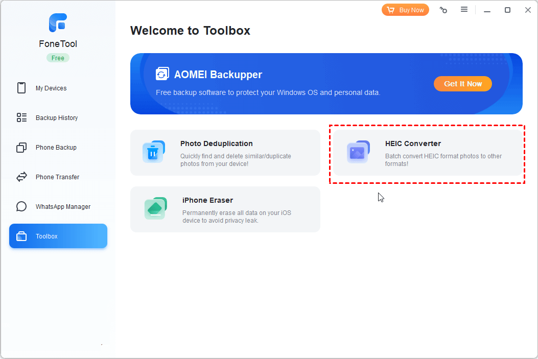 >> To convert HEIC to JPG without losing quality, you can go to Toolbox > Select HEIC Converter.