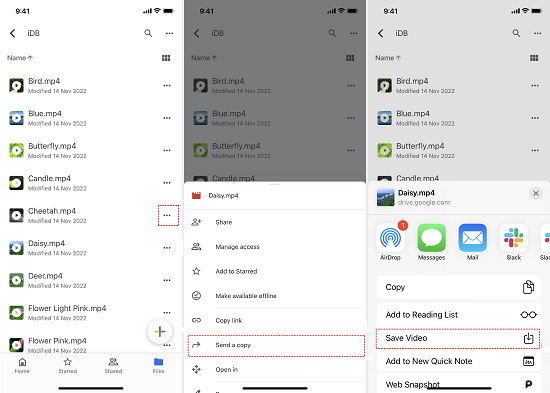 Step 4. Locate the uploaded videos in the app > Tap on each video and select the download option (three-dot menu > Send a copy > Save Video).
