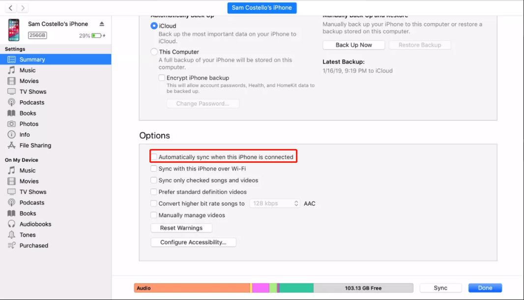 Step 2: Navigate to the Summary tab > In the Options section, uncheck Automatically sync when this iPhone is connected. Then, check Manually manage music and videos and click Done.