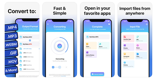iConv is a video converting app only for iOS devices, you need to install it on your iOS device to use it. iConv provides free conversion functions that can help you convert video files from specified outputs to desired output file types. Some of the video output file types include WebM, WMV, MKV, AVI, MPEG, MP4, MOV, etc.
