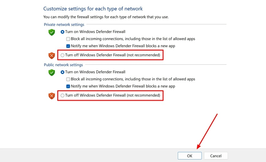 Step 3. Under both Private and Public network settings, choose the option to turn off the firewall, then click OK.