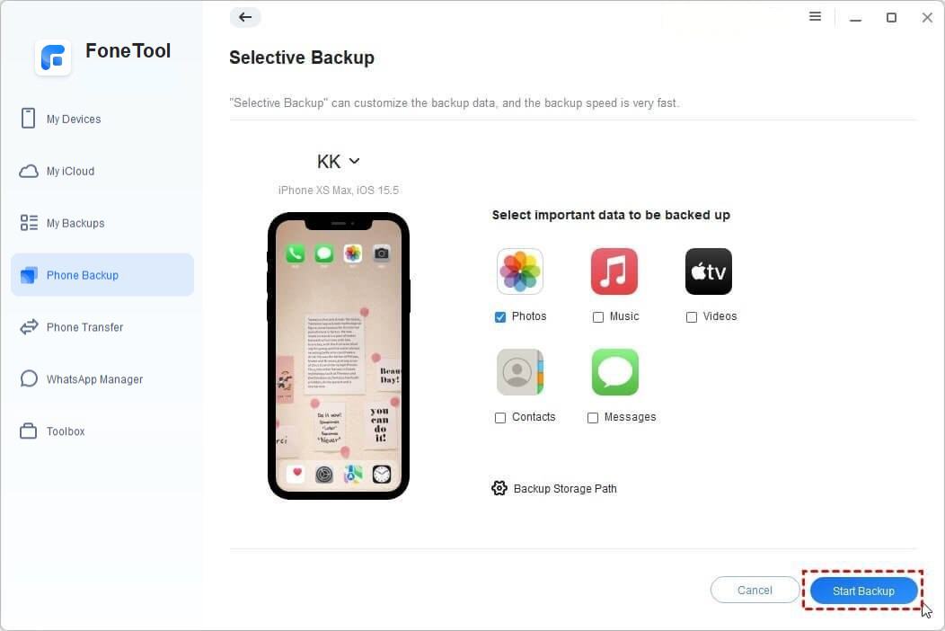 Step 3. Then decide a Backup Storage Path to save your photos > Click Start Backup button to backup iPhone photos to PC.