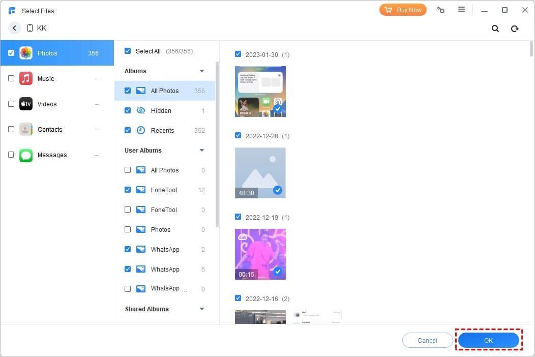 Step 2. Click the Photos icon to preview and select the needed files > Click OK.
