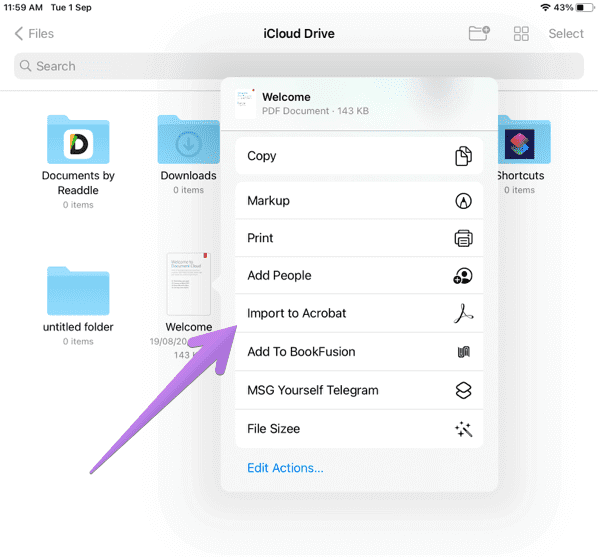 Step 1. On your iPhone, go to Files app > Tap and hold the PDF file you want to transfer > Tap the Share button > Select Import to Acrobat.