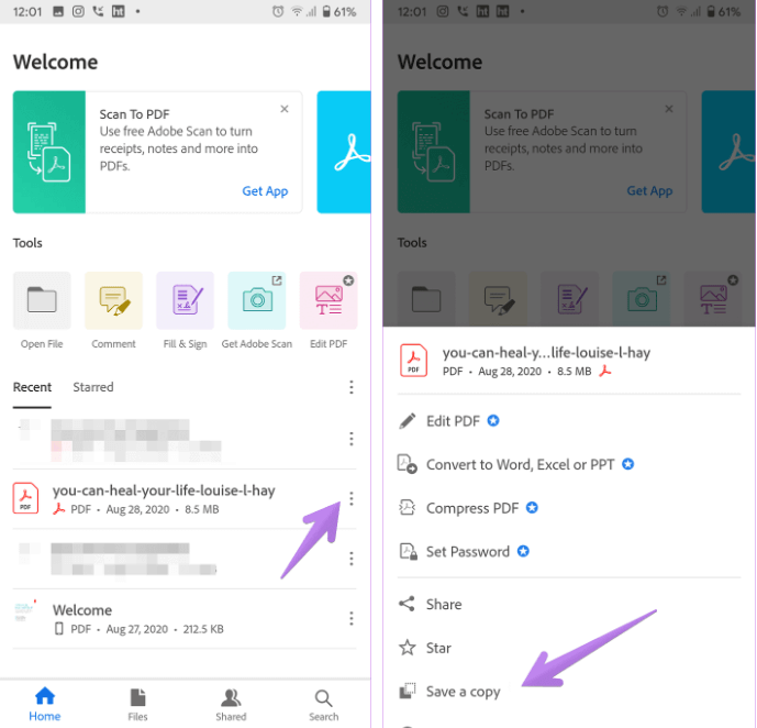 Step 3. Tap on the three-dot icon next to the PDF file in Acrobat Reader and select Save a copy to save PDF to the Android phone.