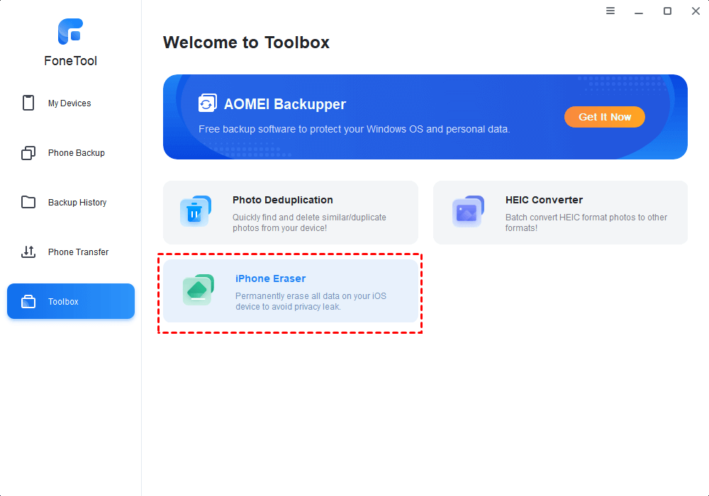 2. Click Toolbox > iPhone Eraser on the Home page.