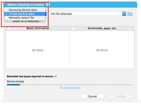 Step 4. If you have no previous backups, select Restore Now > Select a Different Backup > Select iTunes Backup Data from the top left on the Smart Switch.