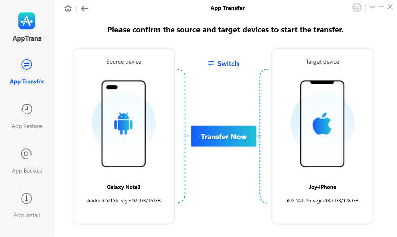 AppTrans is a useful desktop tool that provides a simple and straightforward way to move apps between Android phone and iPhone, allowing you to switch between operating systems without losing your favorite apps.