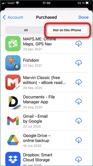 Step 2. Tap Purchased > Choose Not on this iPhone > Scroll down to locate the app you want to install > Tap the Download icon to install apps from the list.