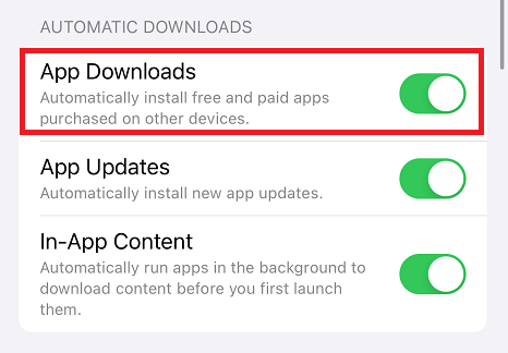 Step 2. Under AUTOMATIC DOWNLOADS, switch on the toggle next to App Downloads.
