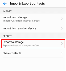 Step 2. Select Import/Export contacts > Export to storage. Then, your contacts will be saved in VCF form in your phone memory.