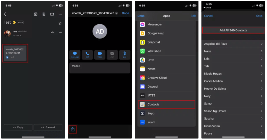 6. On your iPhone, open the received VCF file and follow the prompts to add the contacts to your device.