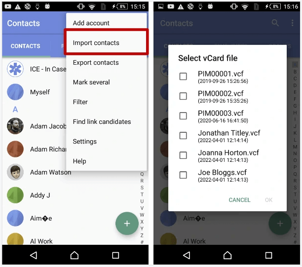 - Copy the vCard files to either your device's internal storage or SD Card.