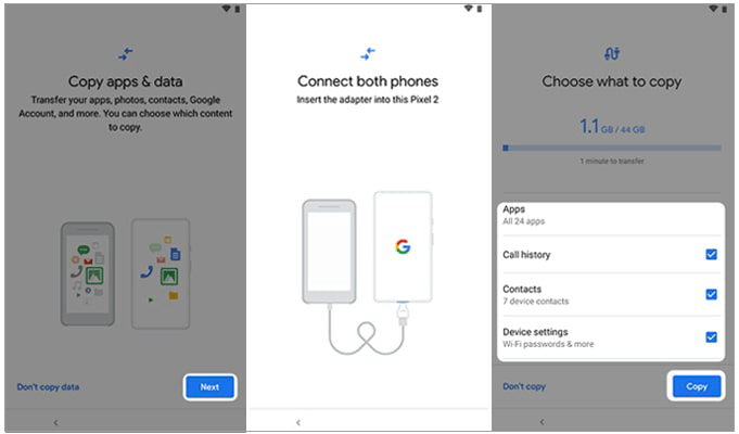 1. Set up new Google Pixel phone. Follow the prompts displayed on the screen and tap "Next" when you reach the "Copy apps & data" screen.