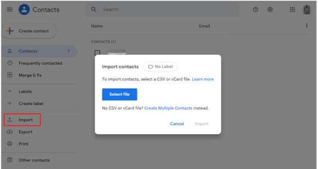 Step 4. Head to Google Contact Website and select Import from the left pane > click Select file > select the vCard files exported from iCloud.