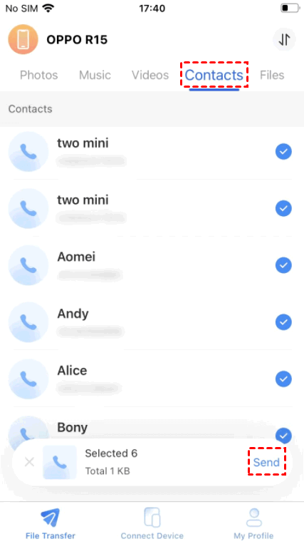Step 3. Navigate to File Transfer, select Contacts on the source iPhone, preview and select contacts to transfer, and then tap Send to start the transfer.