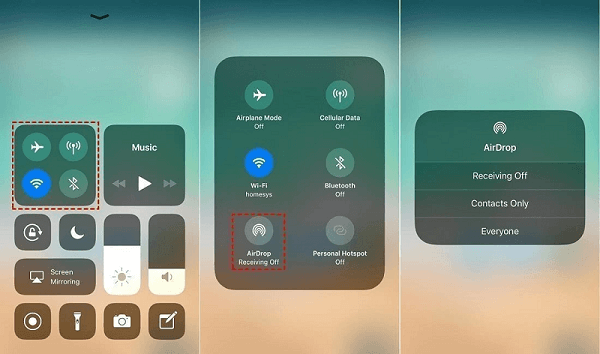 Step 1. Swipe up from the bottom or down from the top right corner to open Control Center > Press and hold the wireless control box in the upper-left corner, tap AirDrop. (Select your preferred AirDrop mode: Receive Off, Contacts Only, or Everyone.)