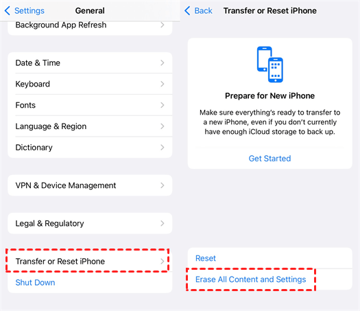Step 2. On your new iPhone, go to Settings > General > Reset (Transfer or Reset iPhone) > Erase All Content and Settings.