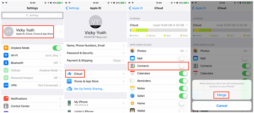 Step 2. On each iPhone, navigate to Settings > [Your Name] > iCloud > Contacts. Toggle Contacts and select Merge when prompted to merge contacts.