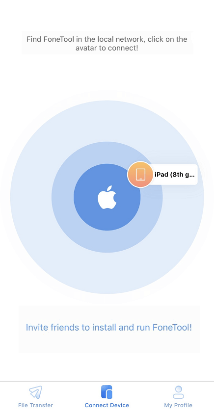 Step 1: Launch the FoneTool app on both iPhone and iPad > Tap Connect Device and select the name of the other iPad to establish a connection.