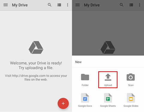 Step 2. Launch the app on your source device > Log in with your Google account > Tap the “+” icon and choose Upload to upload your files.