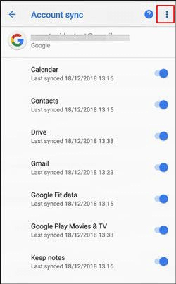 • Enable the data types you want to transfer > Click the three dots in the upper-right corner > Tap Sync Now. Wait for the files to be synced to your Google account.