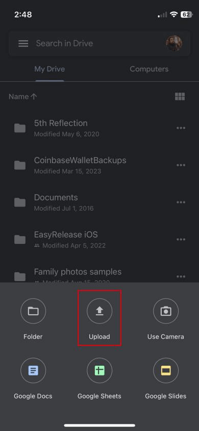 Step 4. Tap Upload > Choose Upload to Google Drive. Your Google Drive account will start to receive the specified files.
