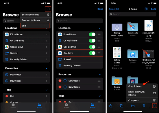 Step 3. Open OneDrive in Files > Copy the files and folders that you want to transfer to iCloud Drive.