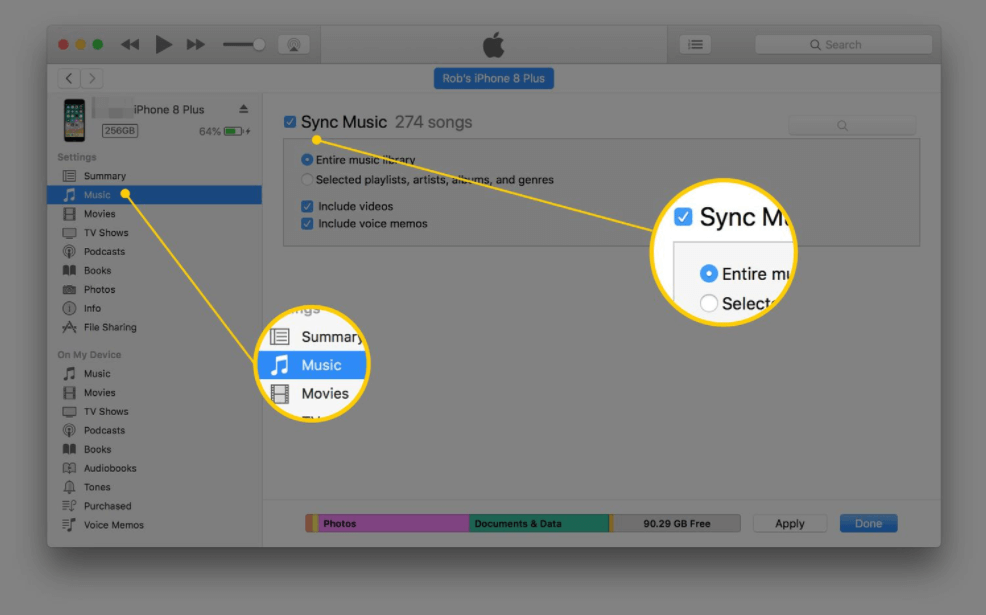 Step 2. Launch iTunes > Click on the device icon > Select a type of content you want to sync (for example, Music or TV Shows) in the sidebar on the left.