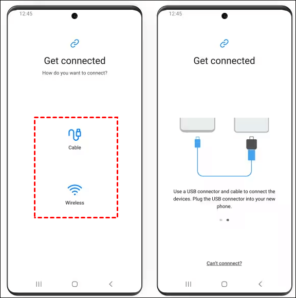 Step 1: Download the Smart Switch app on both Samsung phones > Select a transfer mode (either with a cable or wirelessly) on the source Samsung device.