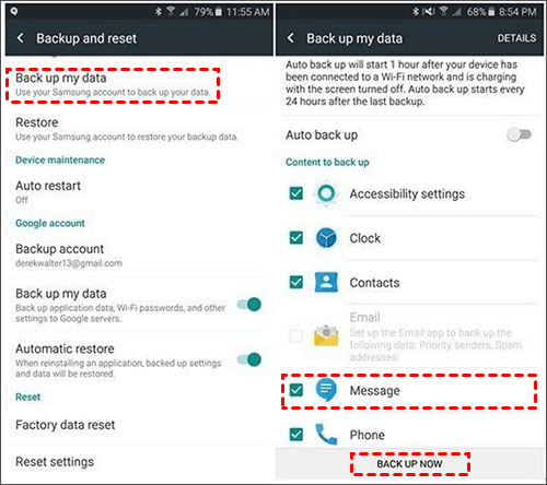 Step 1: Navigate to Settings on your old Android device > Tap Backup and reset > Go to the Back up my data section and enable Messages > Click Back Up Now to perform the backup.