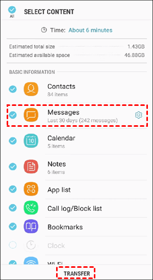 Step 2: Choose Messages as the data to be transferred and tap the TRANSFER option to commence the process.