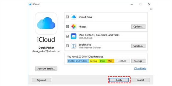 Step 1: Launch iCloud and sign in with your Apple ID. Then, you need to choose content to backup and click the Apply tab to save your backup settings.