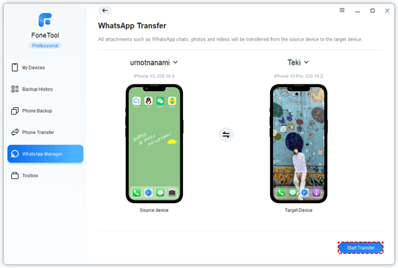 Step 2: Choose WhatsApp Manager on the left navigation bar and choose WhatsApp > WhatsApp Transfer > Start Transfer. Then, wait for the transfer process to complete.