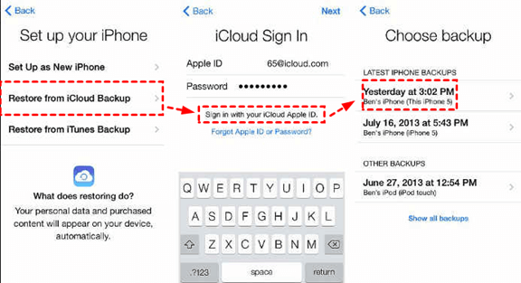 Step 3: After the WhatsApp backup is completed, turn on your iPhone and choose Restore from iCloud Backup > sign in with your Apple ID > choose the latest backup to restore WhatsApp from PC to iPhone.