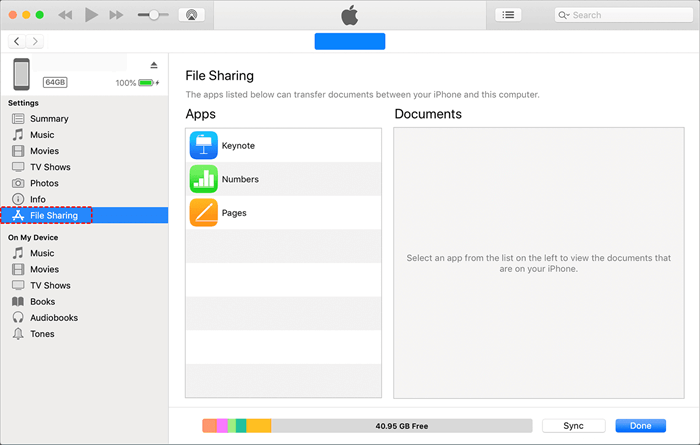 Step 2: Click File Sharing and choose WhatsApp to transfer data from PC to iPhone.
