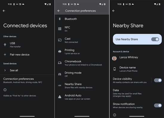 - Go to Settings > Connected Devices > Connection Preferences > Use Nearby Share.