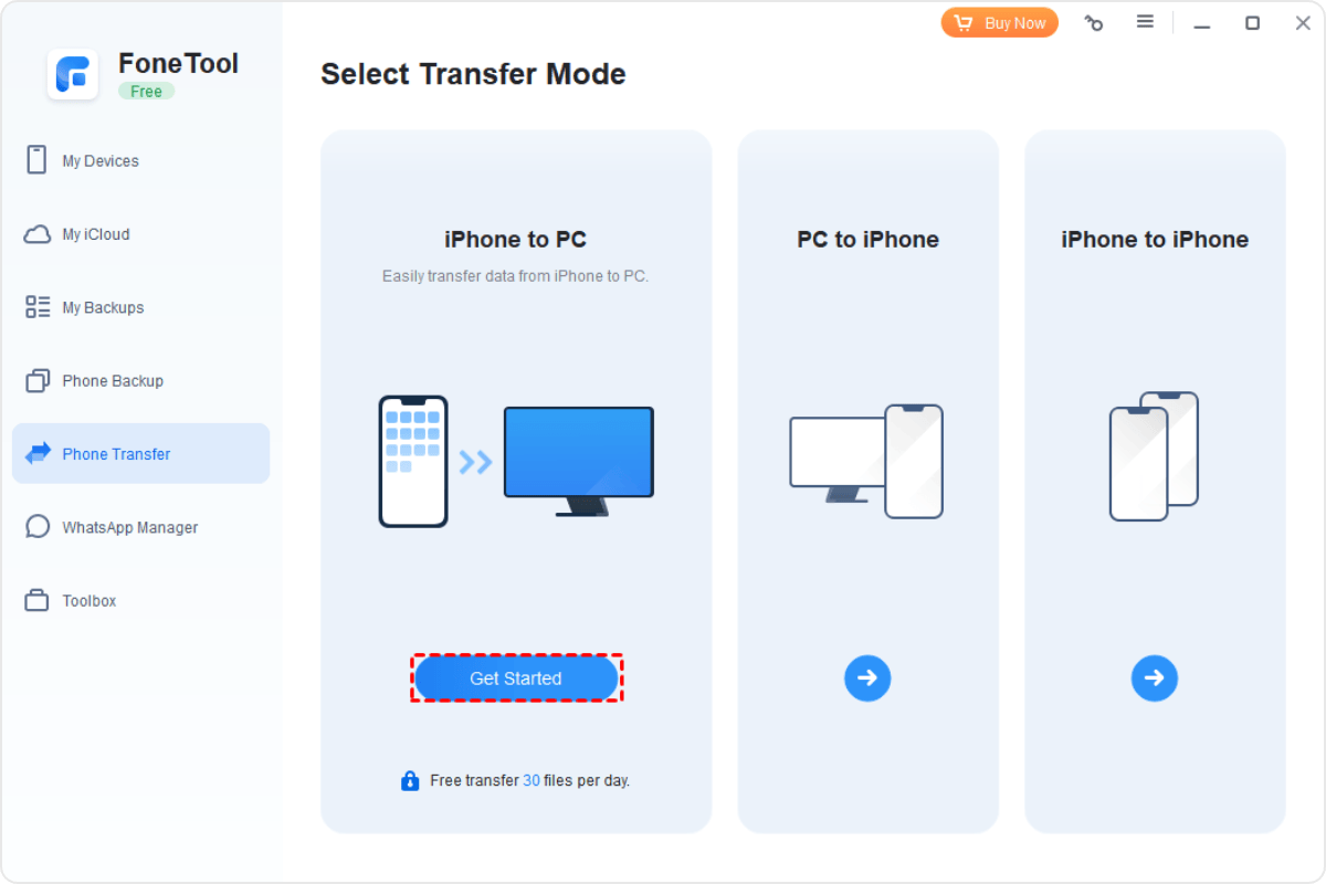 Step 2. Choose Phone Transfer > Go to iPhone to PC and click Get Started.