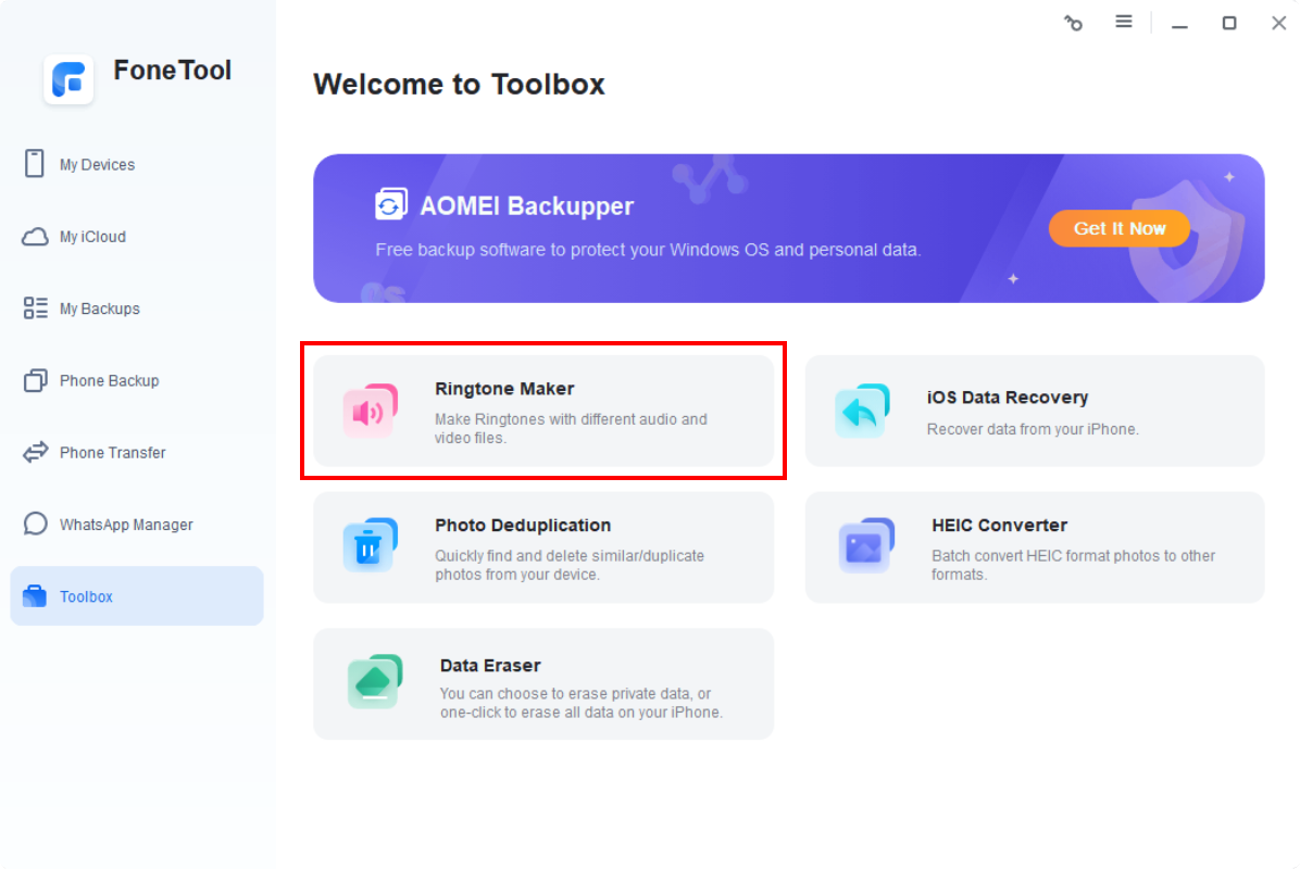 Launch the FoneTool, and go to Toolbox -> Ringtone Maker.