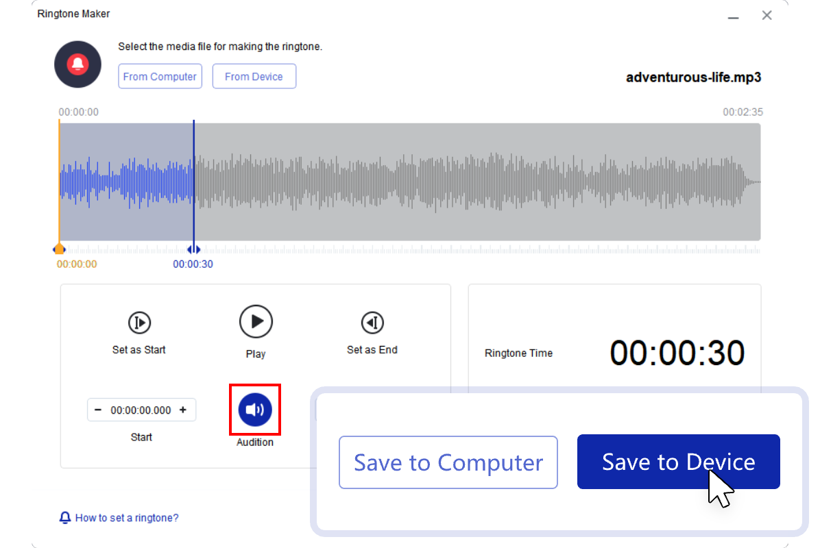 Preview your ringtone, confirm it and click Save to Computer or Save to Device.