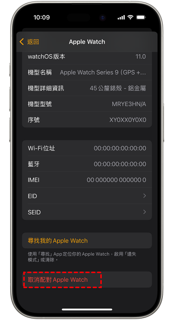 2. 如果有配對的手錶,選取要取消配對的Apple Watch旁邊的i圖標 > 輕按取消配對Apple Watch。