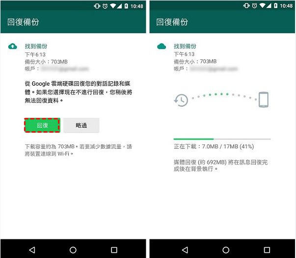 Android 回復數據時會自動從 Google Drive 中檢索備份檔案,當 Google 雲端硬碟中沒有可用的備份時,它會自動檢索本地儲存以查找備份。因此,將 WhatsApp 相片等數據儲存到 SD Card 後,您還是可以很輕鬆地回復數據。